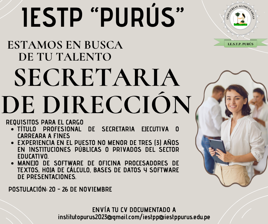 La institución convoca a profesionales interesadas en ocupar el puesto de Secretaria de Dirección, para laborar en nuestra sede ubicada en la provincia de Purús. El contrato es por un año y el inicio de labores está programado para el 02 de enero. Disponibilidad para residir y trabajar en Purús durante el periodo contractual. Experiencia […]