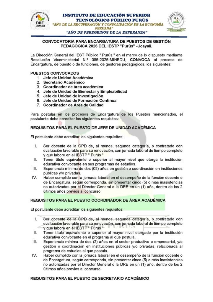 Encargatura de puestos de función pedagógica 2026 del IESTP «PURÚS»