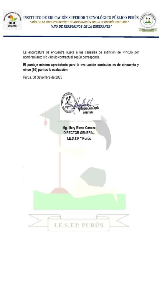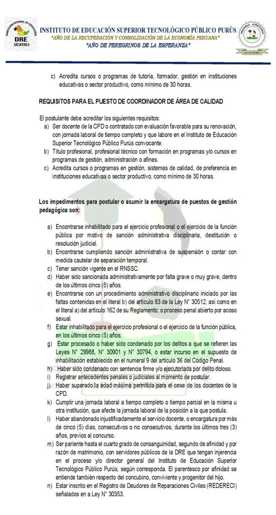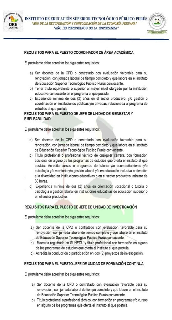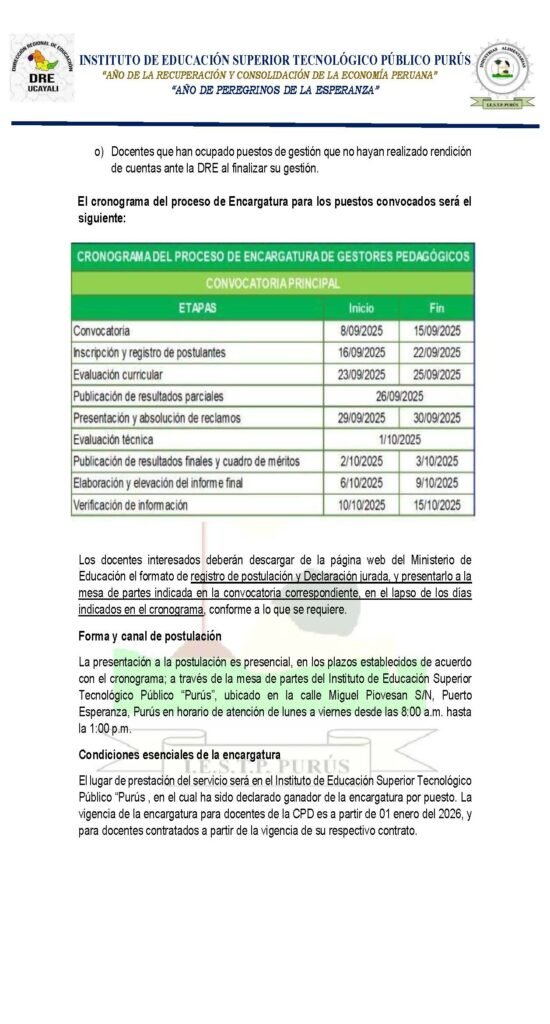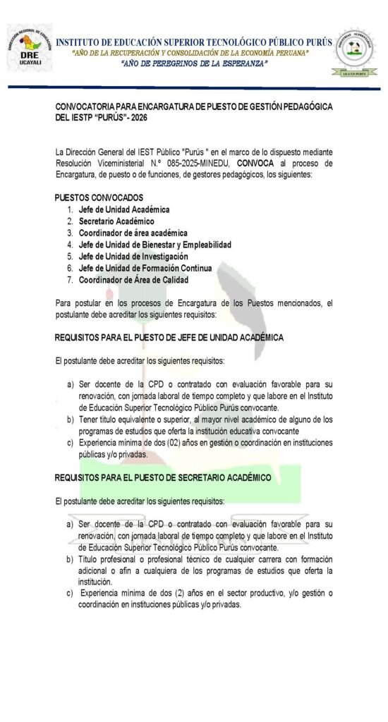 Encargatura de puestos de función pedagógica 2026 del IESTP «PURÚS»