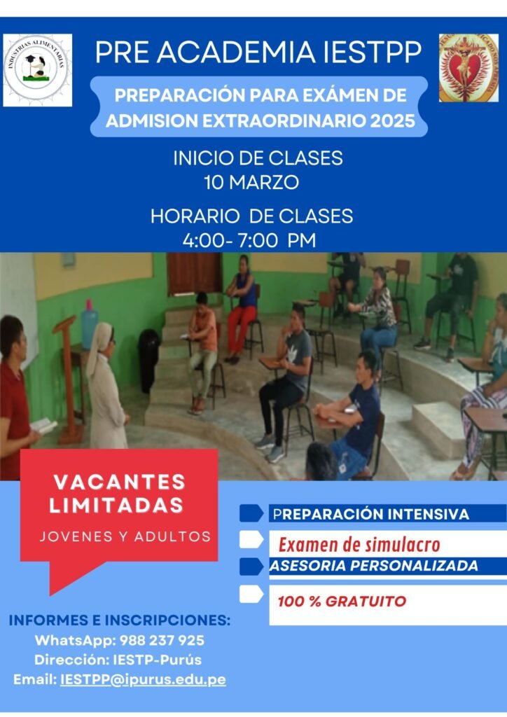 Se invita a todos los jóvenes y adultos que han concluido el nivel secundario a participar en la Preacademia del Instituto de Educación Superior Tecnológico Público Purús (IESTPP) para la preparación del examen de admisión extraordinario 2025.